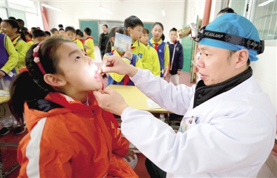 为了引起青少年对口腔健康的重视,江西省赣州市教育局和赣南医学院第一附属医院联合举办的关爱青少年口腔健康大型公益活动在西津路小学启动。据悉,该活动将走进该市中心城区各中小学,进行口腔健康宣教和免费口腔健康检查,并为学生们建立中小学生口腔健康档案。图为11月25日,医务人员在给西津路小学的学生检查口腔。刘青摄/光明图片