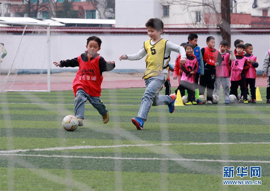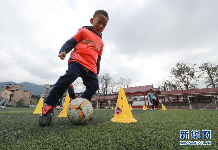 1月16日,在贵州省铜仁市玉屏侗族自治县印山民族小学,小球员在进行足球训练。 近年来,贵州省铜仁市玉屏侗族自治县大力发展少年足球运动,利用寒假时间开设足球课堂,吸引孩子们来到绿茵场参与足球训练,学习足球知识,享受运动的快乐。 新华社发(胡攀学 摄)