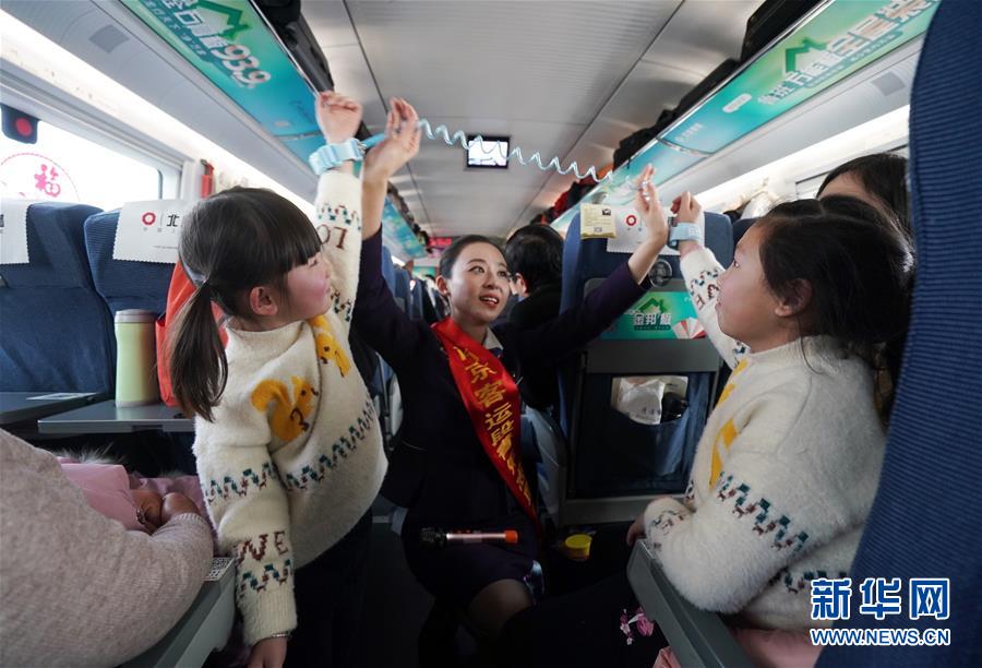1月19日,在G106次列车上,南京客运段“紫金心”志愿者和小朋友们演示防走失儿童专用手环的用法。 春运期间,中国铁路上海局集团有限公司南京客运段“紫金心”志愿者服务团队联合“宝贝回家”志愿者协会,在列车上开展“万家春运团圆路,紫金守护宝贝行”专项活动,向旅客们传递走失儿童信息,发动他们“线上线下”互动,普及儿童防走失知识,在列车上增设防走失儿童专用手环,增强家长的安全意识,守护孩子们平安回家。 新华社记者 季春鹏 摄