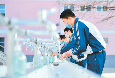 3月13日,青海省海东市互助土族自治县民族中学的学生在进入食堂用餐前洗手。新华社记者 张 龙摄