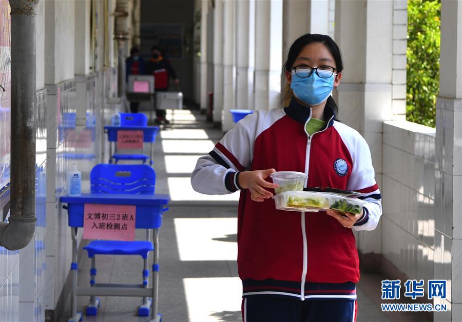 4月13日,河南省实验文博学校初三年级学生领取午餐。新华社记者 李嘉南 摄