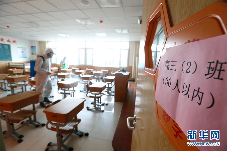 4月14日,山东省青岛通济实验学校的工作人员在对教室进行消毒。新华社发(梁孝鹏 摄)