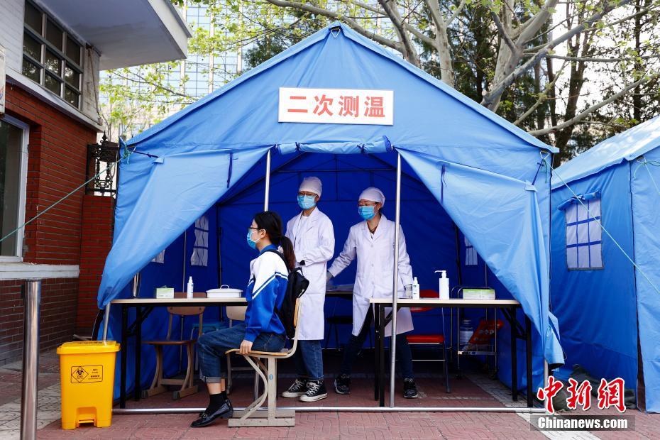 一名入校时体温异常的“学生”进行二次测温。中新社记者 富田 摄