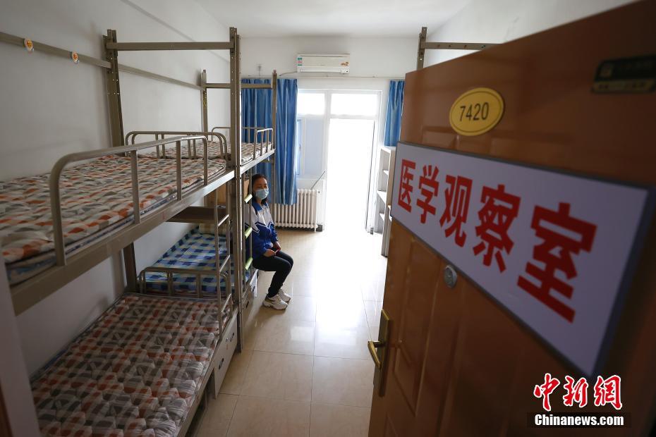 一名体温异常的住校“学生”被转移到宿舍楼的医学观察室。中新社记者 富田 摄