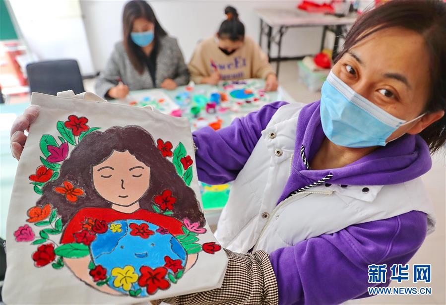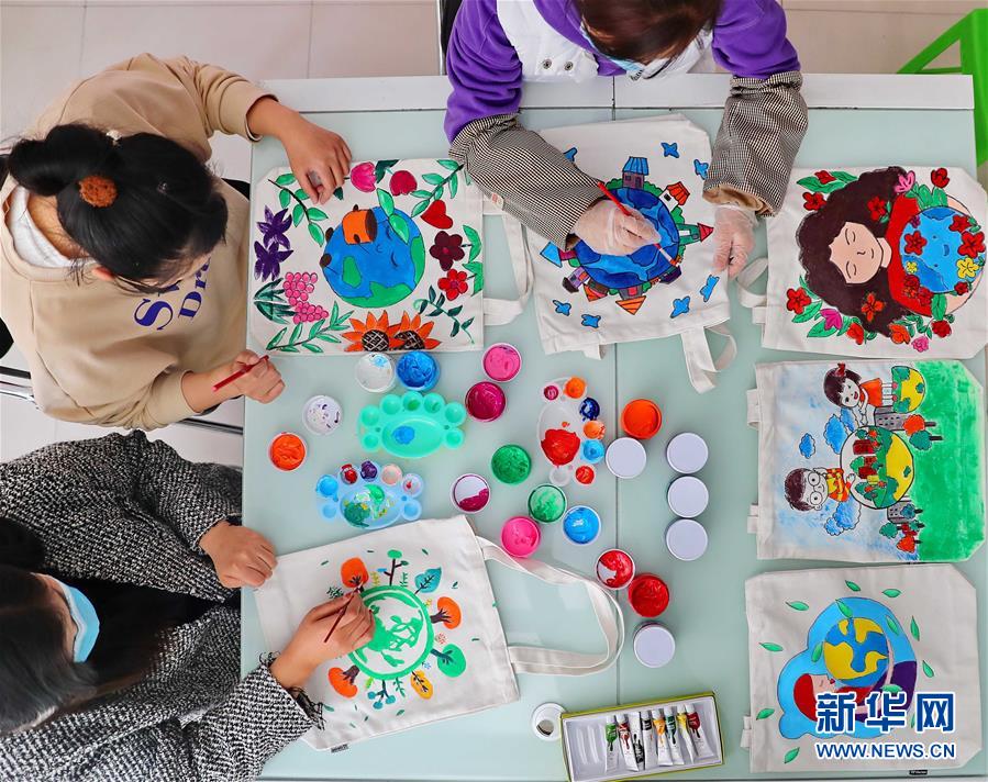 4月21日,河北省秦皇岛市海港区建新里社区开展“彩绘布袋倡环保”活动,工作人员在彩绘布袋。 4月22日“世界地球日”即将到来之际,各地开展主题活动,增强人们热爱地球、保护环境的意识。 新华社发(曹建雄 摄)