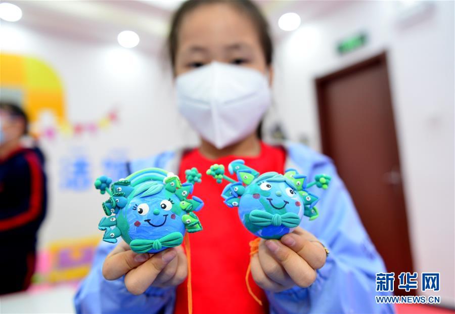 4月21日,合肥市五里拐社区党委联合“在城长”生活馆开展“珍爱地球 人与自然和谐共生”主题手工活动,小朋友展示用彩色黏土制作的“地球”手工作品。 4月22日“世界地球日”即将到来之际,各地开展主题活动,增强人们热爱地球、保护环境的意识。 新华社发(葛传红 摄)