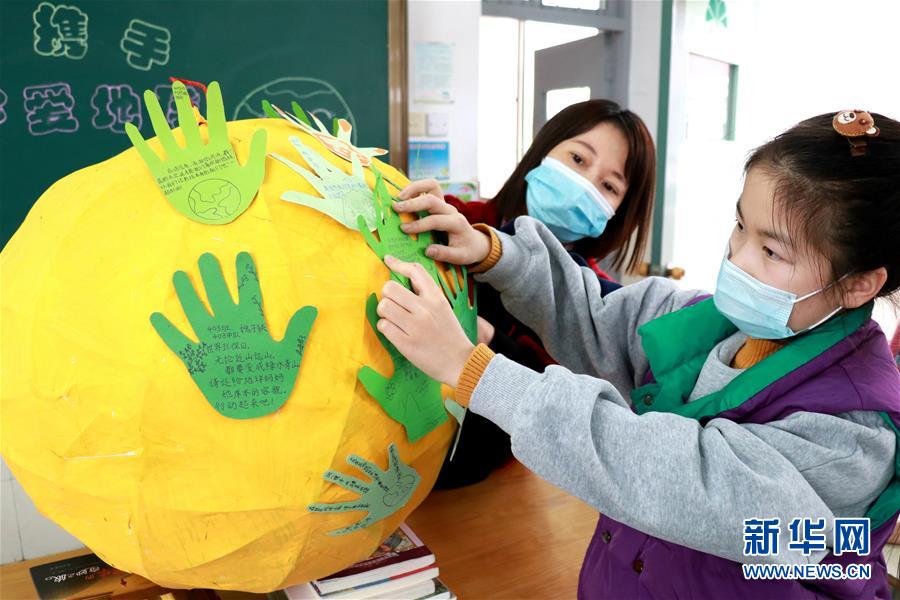 4月21日,浙江省湖州市长兴县实验小学开展“珍爱美丽地球 守护自然资源”主题活动,学生将写有祝福语的“小手”贴到地球模型上。 4月22日“世界地球日”即将到来之际,各地开展主题活动,增强人们热爱地球、保护环境的意识。 新华社发(谭云俸 摄)