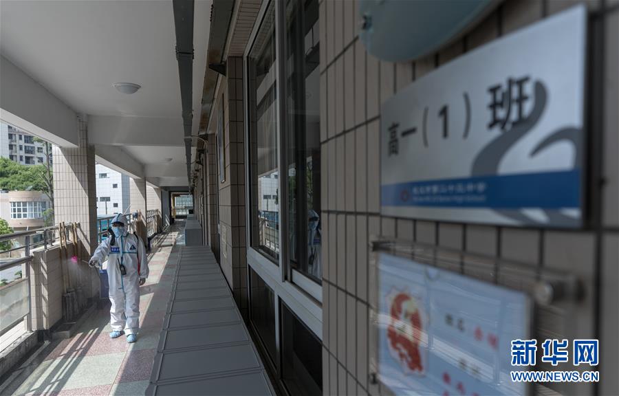 4月22日,武汉市汉阳区消防救援大队消防员在学校走廊进行消杀作业。新华社记者 费茂华 摄