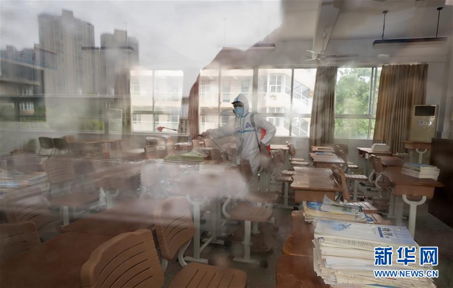 4月22日,武汉市汉阳区消防救援大队消防员在教室进行消杀作业。新华社记者 费茂华 摄