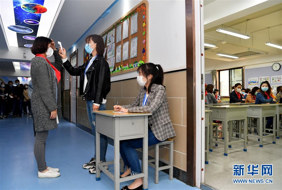 4月23日,西安新知小学的老师们在进行学生进教室测温演练。 当日,位于陕西西安新城区的西安新知小学开展返校开学防疫演练,模拟演练学生入校测温、体温异常应急处置、日常上课等环节,帮助学校工作人员熟练疫情防控流程,保障师生安全有序返校开学。据悉,西安各小学四至六年级将于4月27日开学复课。 新华社记者 刘潇 摄