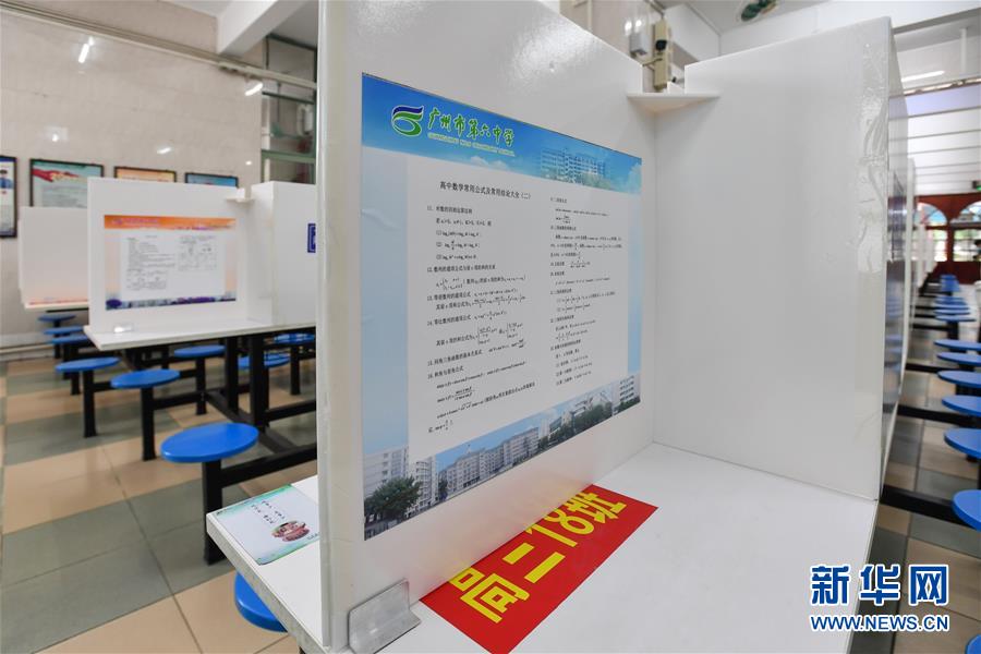 广州市第六中学食堂餐桌隔板上印上了各学科的复习资料(4月23日摄)。新华社记者 刘大伟 摄