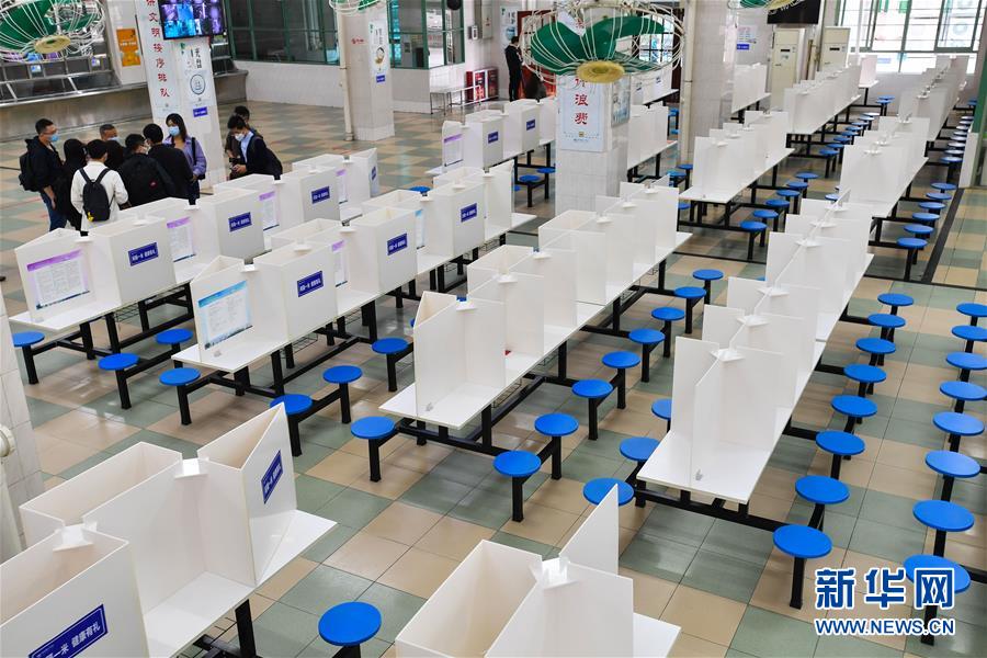 这是广州市第六中学采取了分隔设计的食堂餐桌(4月23日摄)。新华社记者 刘大伟 摄