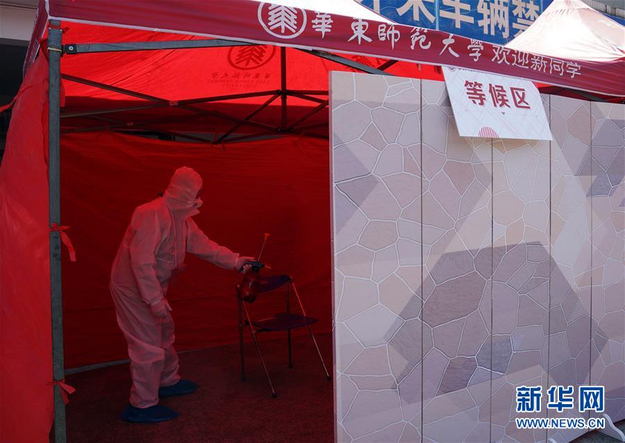 4月23日,在华东师范大学入口处的留观区,工作人员模拟演练体温异常人员离开后的消杀工作。 近日,上海各高校开展返校开学防疫演练,在入校流程、校园管理、教学安排等方面细化措施,保障安全顺利开学。 新华社记者 刘颖 摄