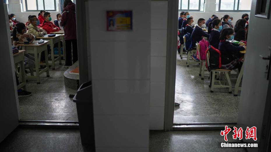 4月26日,学生戴着口罩复课。当日,云南省达到要求的学校,小学四、五、六年级开学复课。昆明市第一中学附属小学近600名学生开学。在“开学第一课”上,老师为学生讲解正确戴口罩、洗手方法等防疫知识。中新社记者 康平 摄