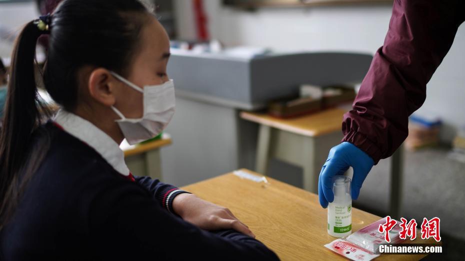 4月26日,老师检查学生携带的手消夜是否有酒精成分。中新社记者 康平 摄
