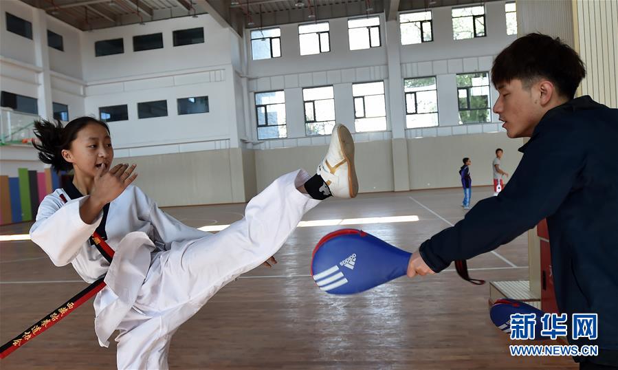 5月4日,孩子们在西藏自治区青少年宫内练习跆拳道。 当日,西藏自治区青少年宫在拉萨揭牌。据介绍,西藏自治区青少年宫2017年7月开工建设,是广东省援藏重点支持项目。该项目总投资1.75亿元,总建筑面积2.7万多平方米,由教育培训、实践活动、主题展馆三个功能区组成。 新华社记者 觉果 摄