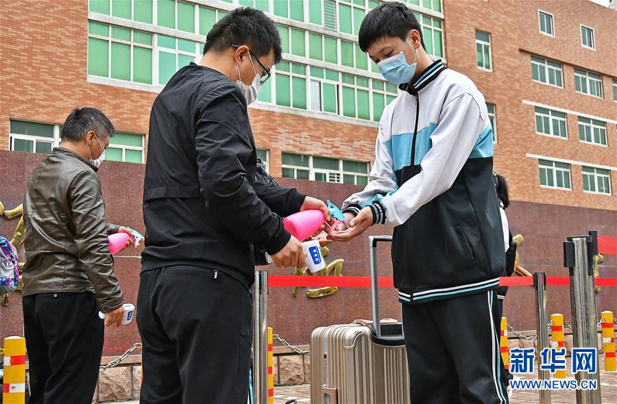 5月8日,山东省烟台市福山区崇文中学初四年级的学生进校前接受手部消毒。 山东省各市初中毕业年级于5月6日至10日陆续开学复课。 新华社发(孙文潭 摄)