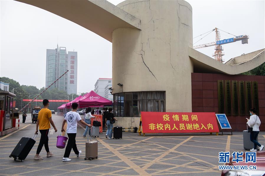 5月8日,在湘潭医卫职业技术学院,学生们走进校门。 当日,湖南省部分高校开学复课。 新华社发(陈思汗摄)