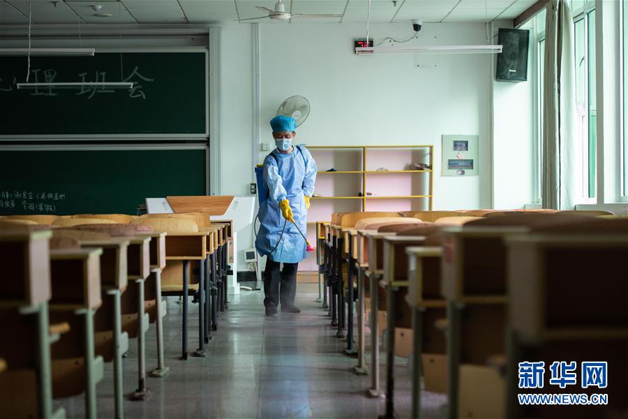 5月8日,在湘潭医卫职业技术学院教学楼,校医在给教室消毒。 当日,湖南省部分高校开学复课。 新华社发(陈思汗摄)