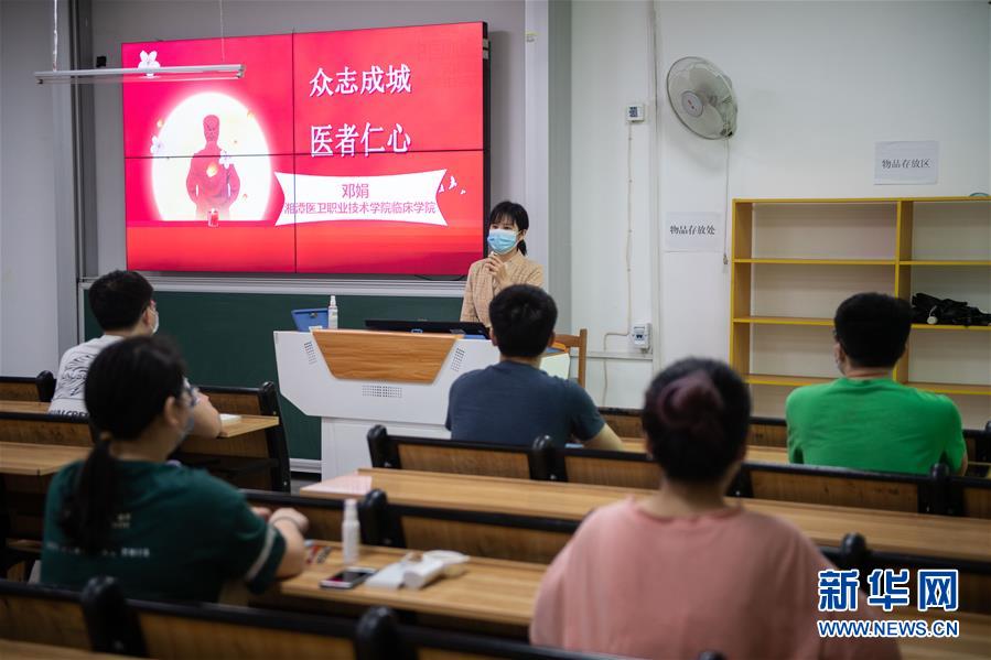 5月8日,在湘潭医卫职业技术学院教学楼,老师在讲课。 当日,湖南省部分高校开学复课。 新华社发(陈思汗摄)