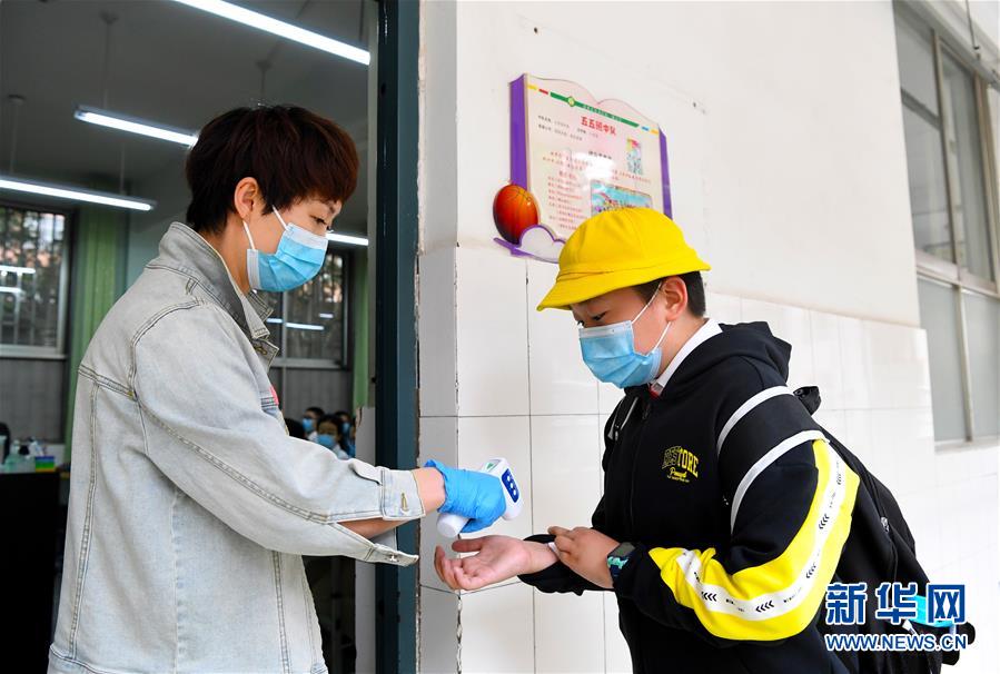 5月11日,郑州市纬一路小学老师对入班学生进行体温测量。 当日,河南省郑州市小学各年级开学复课。 新华社记者 郝源 摄