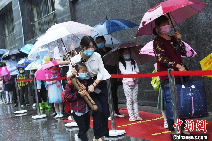 6月2日,在位于重庆市大渡口区的金凤凰幼儿园大门处,学生们戴着口罩有序排队进入校园。当日,在做好疫情防控的前提下,重庆市各幼儿园有序进行开学复课。