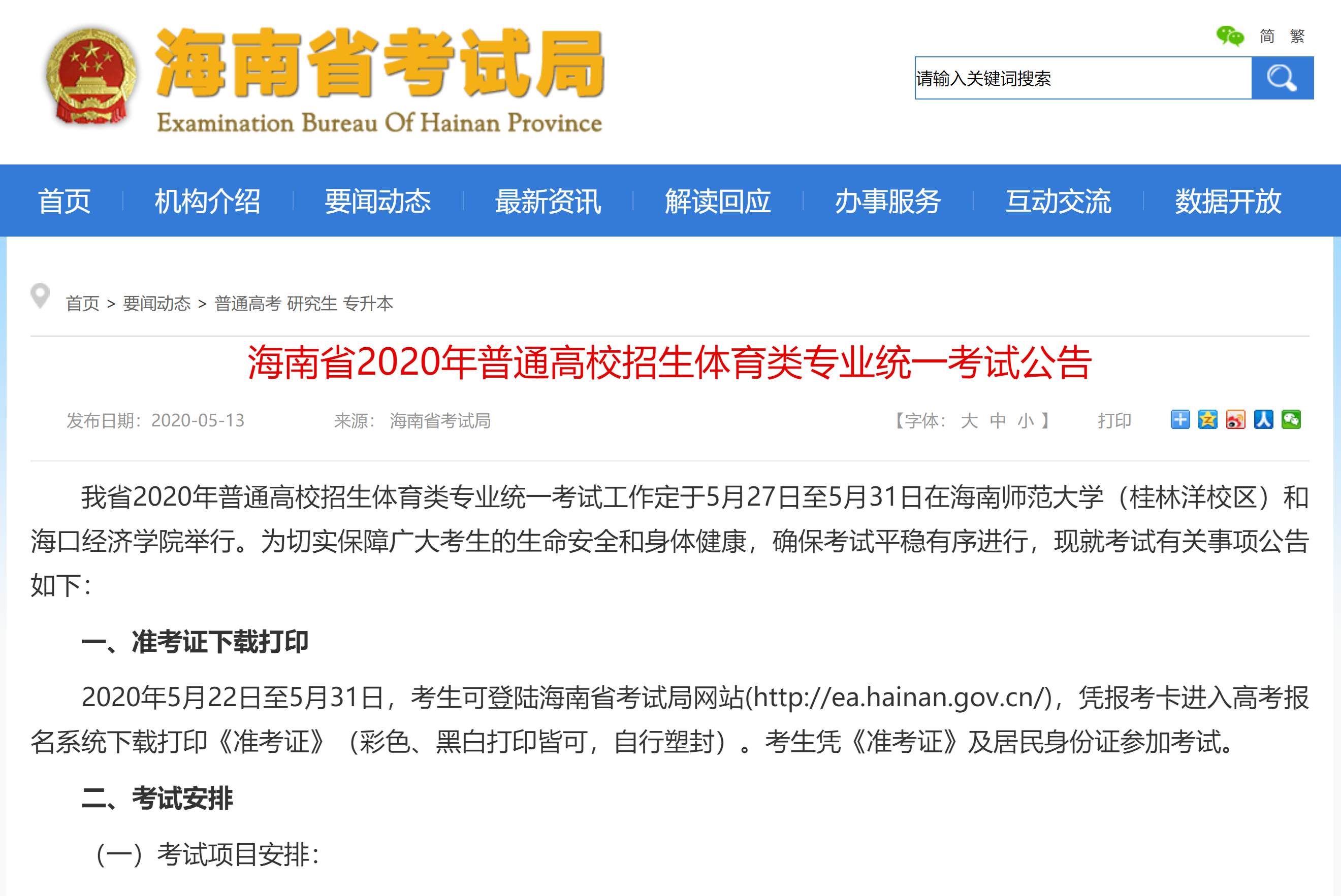 5月13日,海南省考试局发布通知,2020年普通高校招生体育类专业统一考试工作定于5月27日至5月31日在海南师范大学(桂林洋校区)和海口经济学院举行。