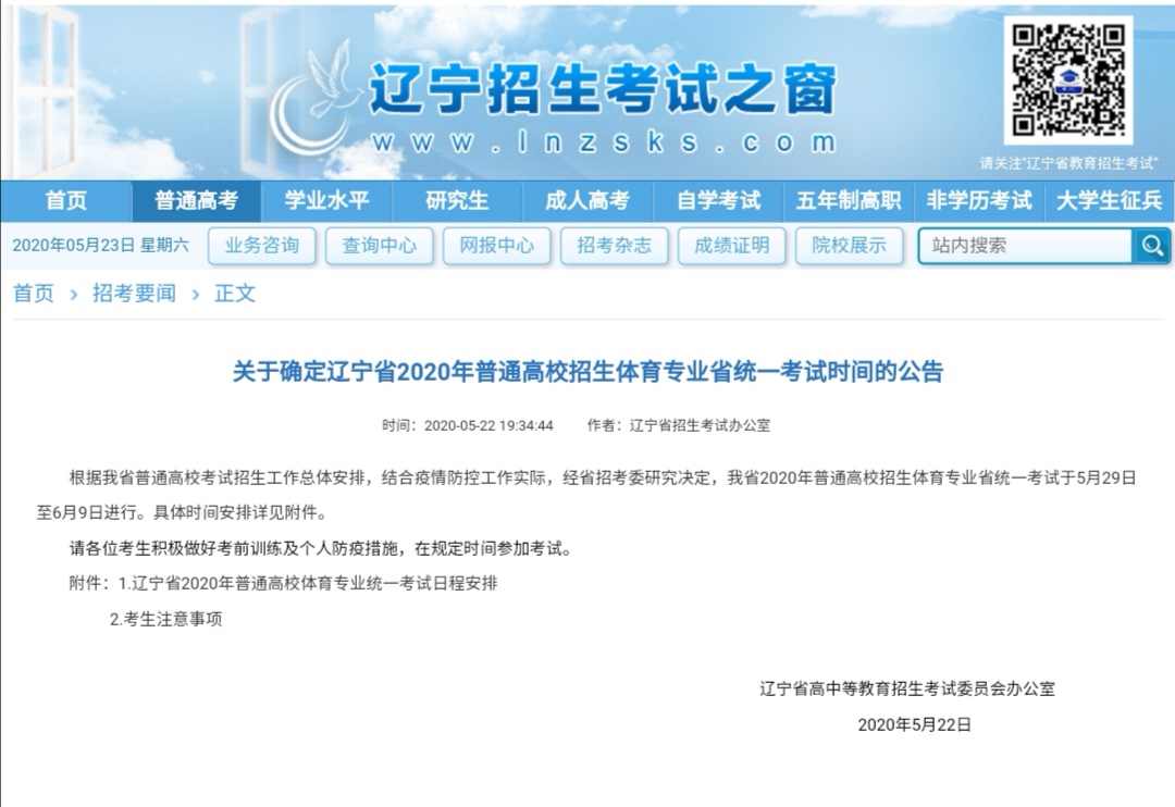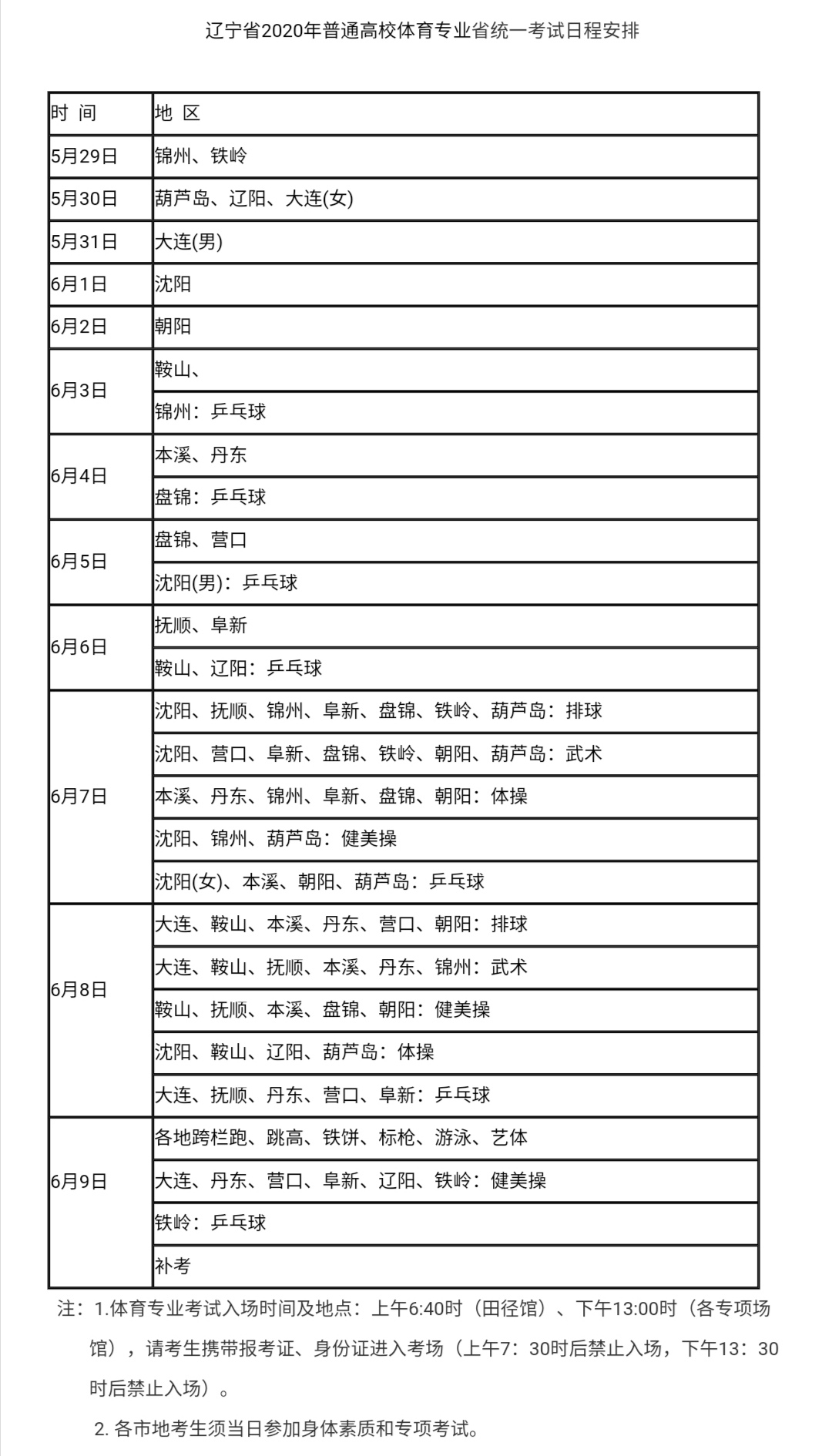 5月22日,辽宁省招考办公布了辽宁省2020年普通高校招生体育专业省统一考试时间,根据全省普通高校考试招生工作总体安排,结合疫情防控工作实际,经辽宁省招考委研究决定,辽宁2020年普通高校招生体育专业省统一考试于5月29日至6月9日进行。