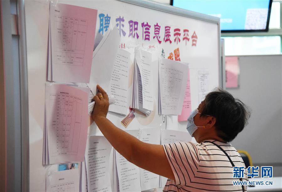 7月2日,外来务工人员在济南市外来务工人员综合服务中心查看招聘信息。 当日,山东省济南市外来务工人员综合服务中心在做好防控疫情的基础上恢复现场招聘活动。 新华社记者 王凯 摄
