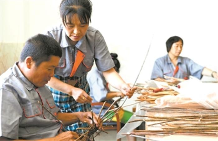 7月14日,在善满家园残障人综合服务中心,培训师王秀萍(左二)指导残疾人学习柳编。