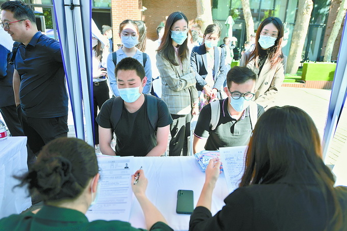 上午9时30分左右,清华大学职业发展中心南侧广场已有很多同学在排队,凭借学生证、预约短信,经过体温测量、查验健康码、手部消毒等程序后,进入会场。“中建集团专场招聘会”,吸引了不少土木工程、建筑工程专业的学生,土木工程系一名研三学生说:“企业的需求跟我专业匹配度很高,希望早点能把工作敲定下来。”一名学金融的女生看中区域投资公司的职位,期待职业生涯能与国家大的项目工程相结合。