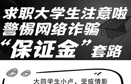 求职大学生注意啦,警惕网络诈骗“保证金”套路,参加网络招聘应首先核实对方真实情况。