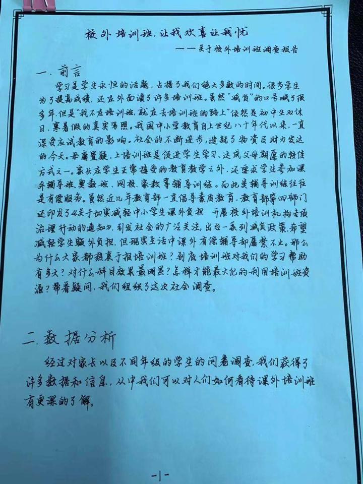 整个小组一共7名同学,他们做的调查报告,题目为《校外培训班,让我欢喜让我忧——关于校外培训班调查报告》。同学们向不同年级的学生、老师和家长发放问卷,共回收了近千份有效问卷,并在杭州5个主要街道做了随机采访。