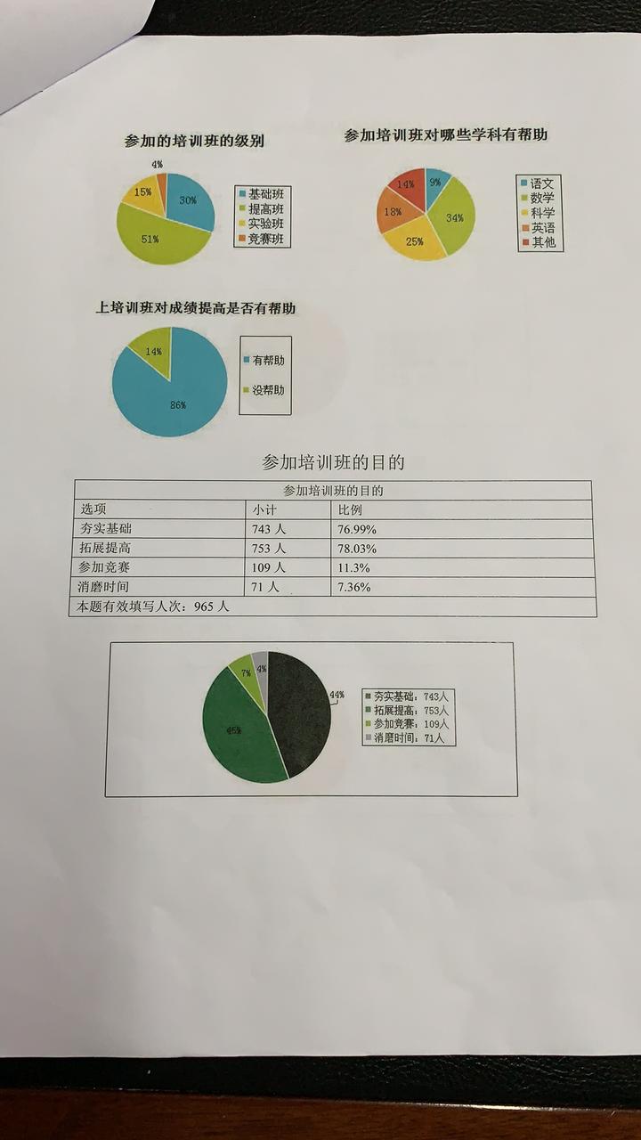 ①上辅导班后成绩的变化:35%进步10名以上,效果还是不错的。其中30%左右的同学进步了5名,超过30%的同学名次不变,也有3%的同学在上培训班后成绩退步了。
