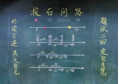 接着,华老师做示范——很简单,问什么就投什么:问徒弟多大?投个石头,22岁。师父多大?再投个石头,42岁。那么,根据题目的意思,师父在徒弟那么大时,徒弟多大?应该是2岁。徒弟长到师父那么大,师父多大?应该是62岁。对了吗?不对,错了没关系,只要不放弃。看出2和62之间的关系了吗?没看出来,没问题,自己来试试吧!