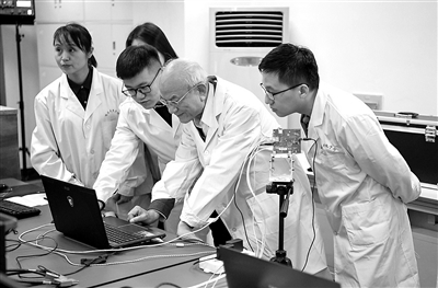 刘永坦(右二)在哈尔滨工业大学实验室钻研雷达技术(2018年12月25日摄)。新华社记者 王松 摄