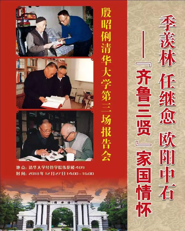 谈及季先生连同任继愈先生、欧阳中石先生,殷老师不禁仰之敬之。殷昭俐指出,三位先生是他最为尊敬的三位学界前辈。三位先生对他教诲最多,恩同再造,他们都是山东人,“亦师亦友亦乡亲”。他们是学界受人尊敬的前辈,也是景行行止的“齐鲁三贤”。由此出发,殷老师为大家分享他对几位先生的认识,深情讲述了三位先生的家国情怀。