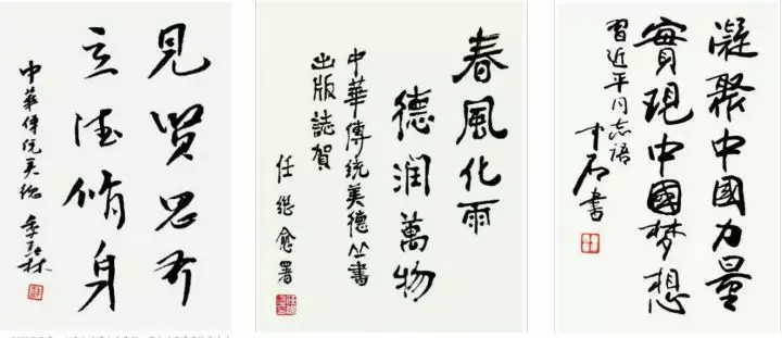 图5:“齐鲁三贤”季羡林、任继愈、欧阳中石先生为《中华传统美德丛书》题词