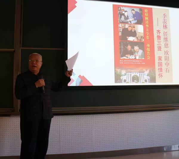讲座伊始,殷昭俐老师盛赞水木清华优良的学风与深厚的历史积淀。殷老师指出,清华是很多大师先贤,求学攻读的母校,清华对前辈们来说,是青年时代最难忘的一段记忆;先贤们对清华来说,又是校史上最光辉的印记。季羡林先生是清华的老学长,也是清华最优秀的校友之一。任继愈、欧阳中石先生与清华园机缘多多。殷老师深情回忆道,多年来,能够和先生相识,得到先生的教泽,分享他们的慈光春晖,实是三生有幸。