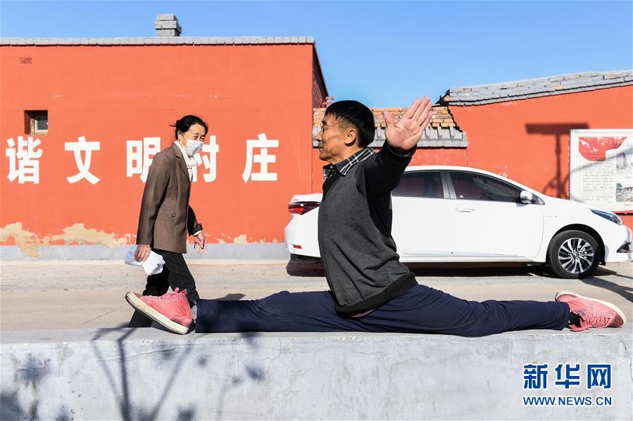 4月26日,在包头市石拐区公益店村,刘子青在村广场上晨练。新华社记者 刘磊 摄