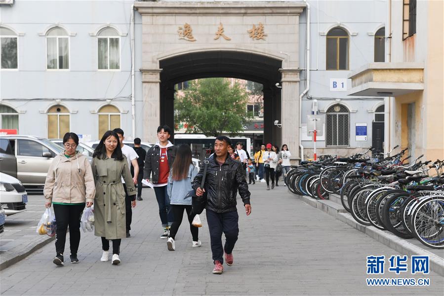 4月25日,刘子青(前排右一)走在包头师范学院的校园里。新华社记者 刘磊 摄