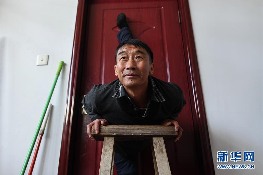 4月26日,在包头市石拐区公益店村,刘子青在家中练习压腿动作。新华社记者 刘磊 摄