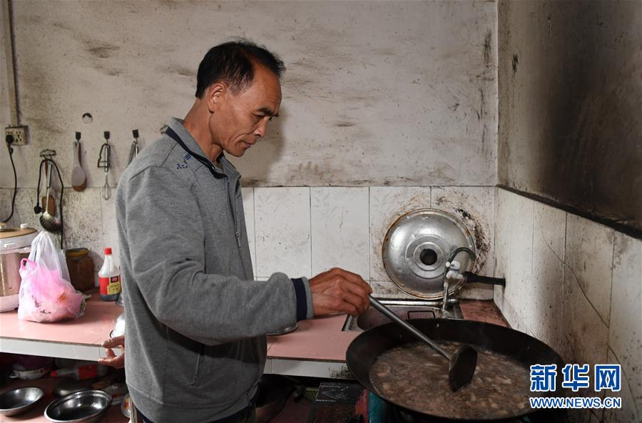 5月28日,周宏军老师在教学点给学生做午餐。新华社记者 陆波岸 摄