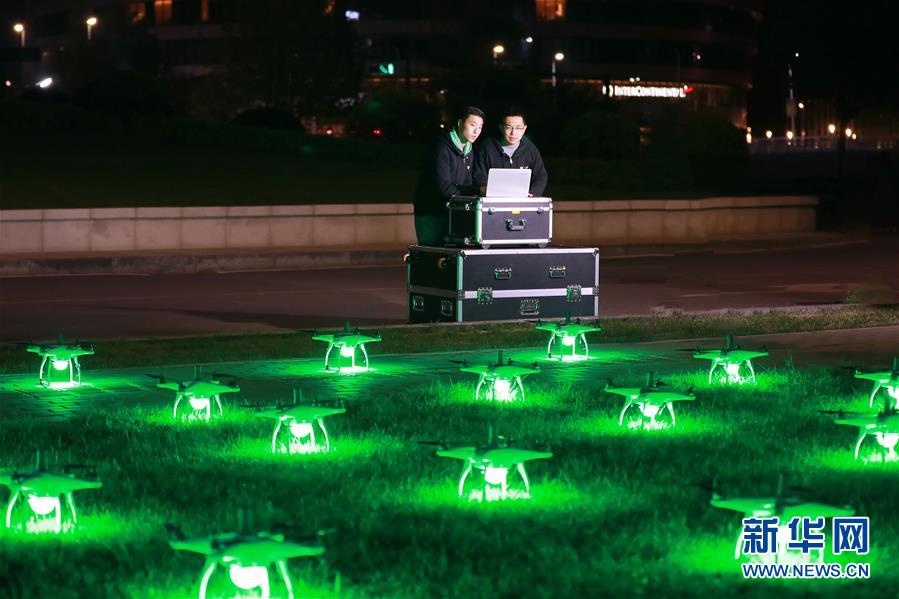 齐俊桐(右)与团队成员为世界智能大会无人机集群编队表演做调试(4月25日摄)。 新华社发