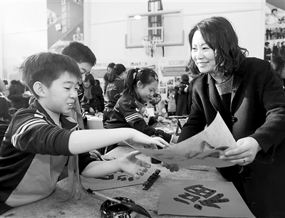 素质拓展课程成果展示中,学生和褚新红畅谈习字心得。 岳晓萱 摄