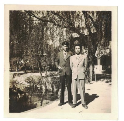 1955年参加国庆游行归來,秦珪(右一)和同事郑兴东在北大未名湖畔留影