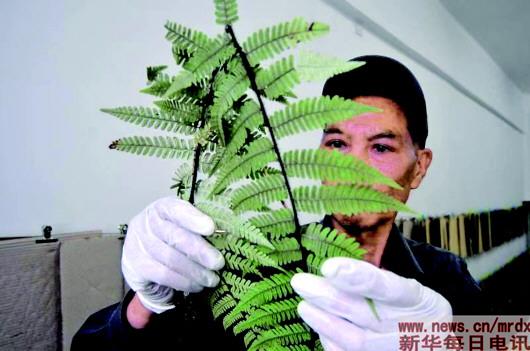 杜凡章在检查一株准备用于制作标本的植物。本报记者周勉摄