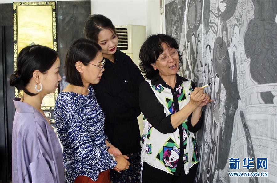 在北京金漆镶嵌有限责任公司,胡昕(右一)为学生讲解壁画艺术(9月20日摄)。 新华社记者 李欣 摄