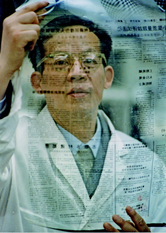 王选正在查看用激光照排系统输出的报纸胶片(1991年摄)。
