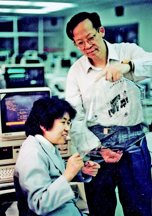 王选与妻子陈堃銶一起查看汉字激光照排系统输出的排版胶片。(1994年摄,资料照片)